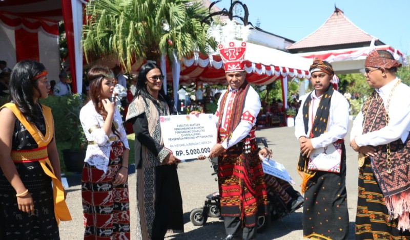 Gubernur dan Wakil Gubernur usai upacara peringatan HUT ke-80 RI ini juga melakukan penyerahan sumbangan untuk penyandang disabilitas serta penyerahan hadiah untuk para pemenang lomba paduan suara, lomba gerak jalan indah, dan lomba drumband antar SMA/SMK se-NTT.