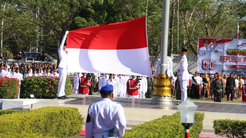 Upacara peringatan HUT ke-80 RI ini berlangsung semarak, tidak saja oleh penampilan Anggota Pasukan Pengibar Bendara Pusaka (Paskibraka) yang tampil memukau tapi juga perpaduan warna-warni pakaian adat khas daerah NTT oleh peserta upacara.